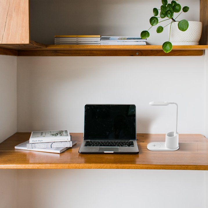 - 1. La lámpara de escritorio se puede utilizar para iluminar mientras que también equipa sus otros dispositivos electrónicos con carga inalámbrica.